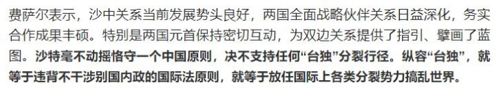 沙特社交大臣费萨尔就地明确表态,将坚贞不屈坚守一个中国原则,毫不支持任何“台独”区别举止,还直言轻松“台独”便是轻松区别,等同于挣扎国际法原则、放任区别势力搅浊天下。