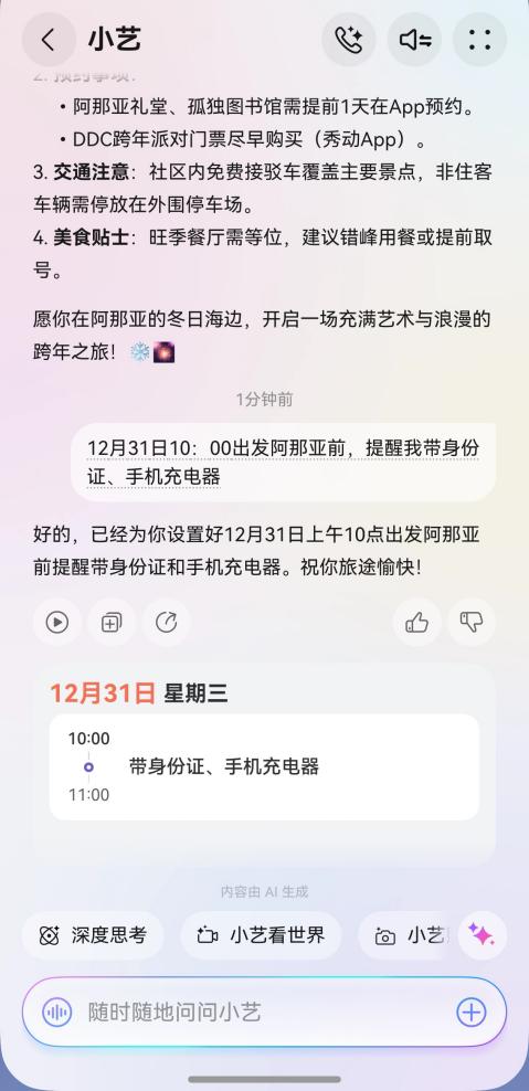 行前准备的细节把控雷同要道。记念遗漏随身物品?叫醒小艺树立任务“12月31日开赴阿那亚前,提醒我带身份证、手机充电器”,到预定时期后不仅有弹窗领导,连结的华为腕表还会同步升沉。这种“一句话惩处”的粗拙,让行前准备从琐碎包袱变为松驰体验。